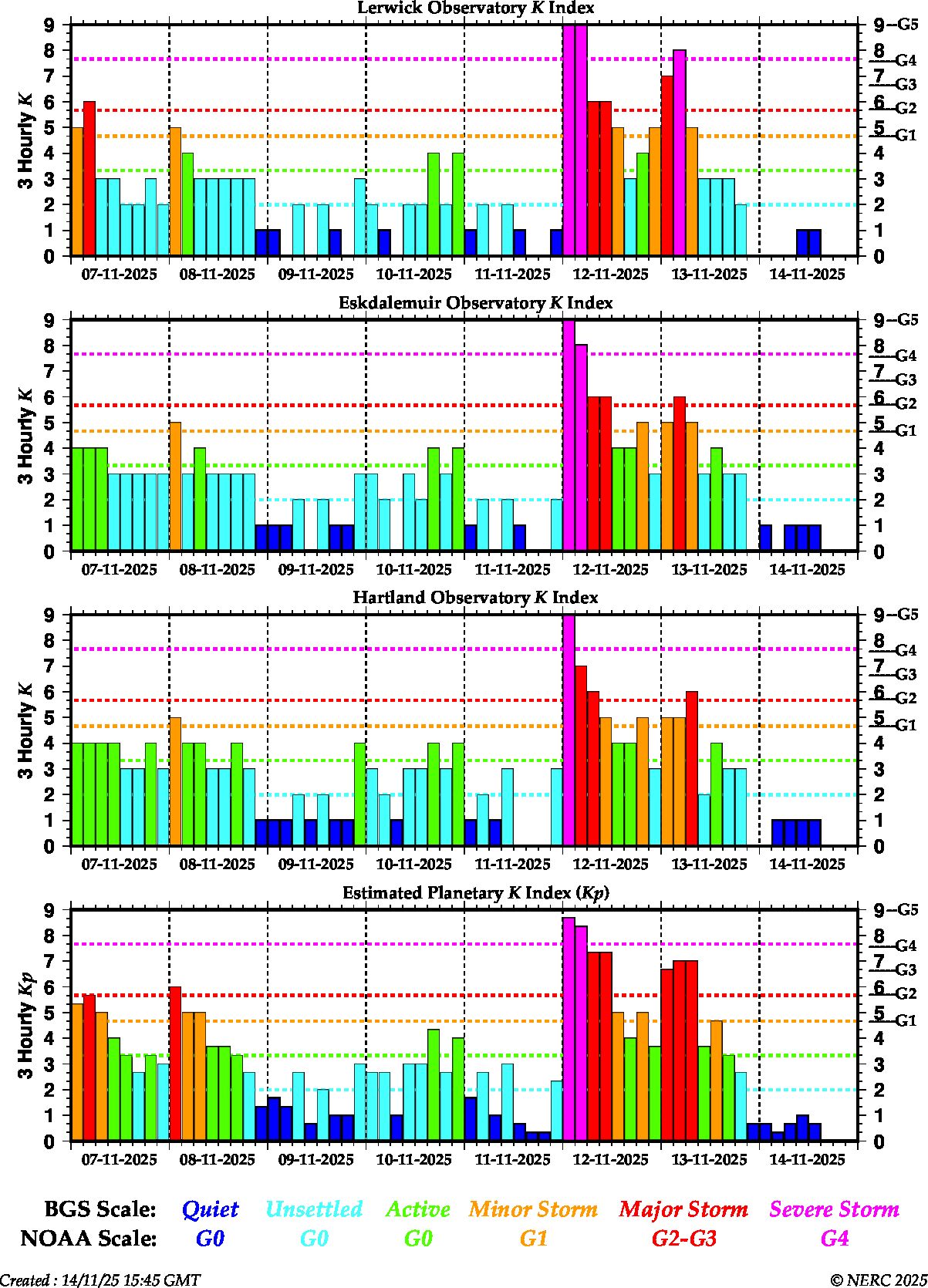 The CME associated with the X5.1 flare from the 11th November arrived on the evening of the 12th. In the UK, geomagnetic activity reached STORM G4 levels between 00:00 and 09:00 UT on 13th November, but the global index only reached STORM G3. Although the interplanetary magnetic field component Bz did turn southward for a while, it did not get that strong (less than 20 nT) and it did not persist for long periods, so we didn’t see the high levels of geomagnetic activity that were originally anticipated.