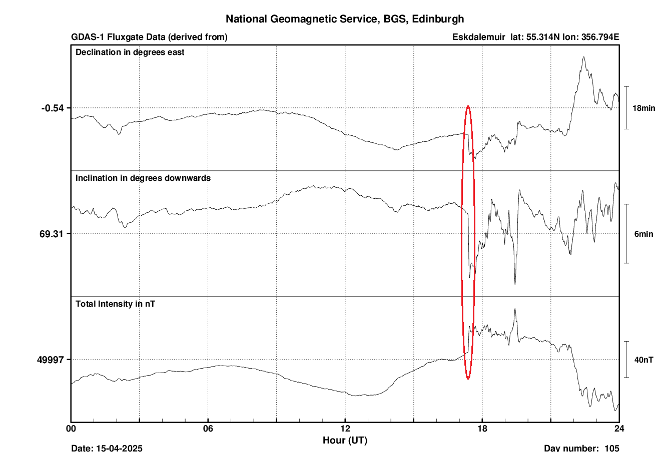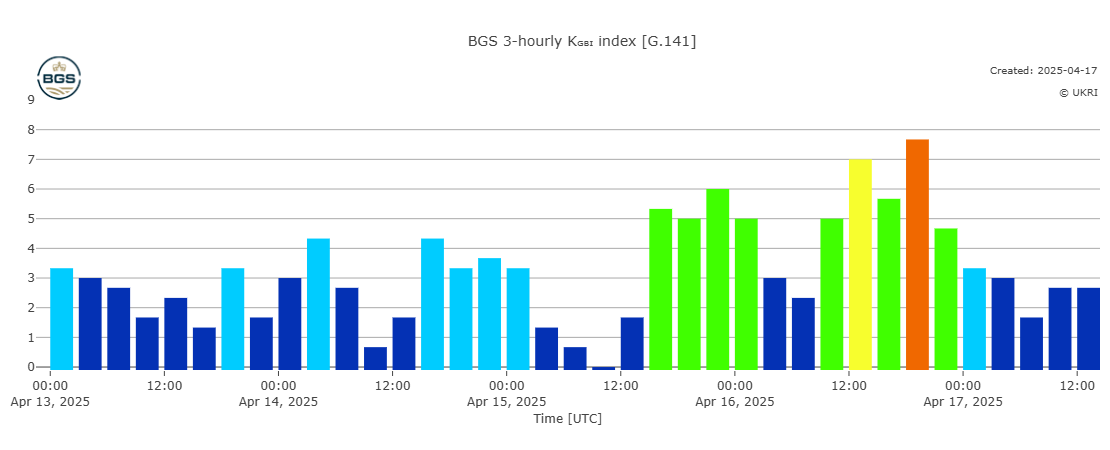Conditions briefly quietened down before picking up and intensifying during 16th April. Prolonged STORM activity followed for 15 hours, peaking at STORM G3 levels (G4 in the UK). Residual effects from this event are continuing, but with a declining trend in intensity.