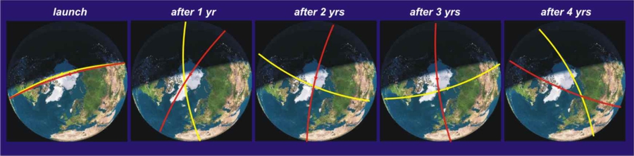 Swarm satellite orbital separation over the mission. The three satellites launch from the same rocket. After launch, Swarm A and Swarm B will be lowered to a height of 450 km while Swarm C will rise to 530 km. The effect is to cause the orbital planes of the satellites to precess at different rates around the Earth. After two years their orbital planes will be approximately perpendicular. Copyright: ESA.